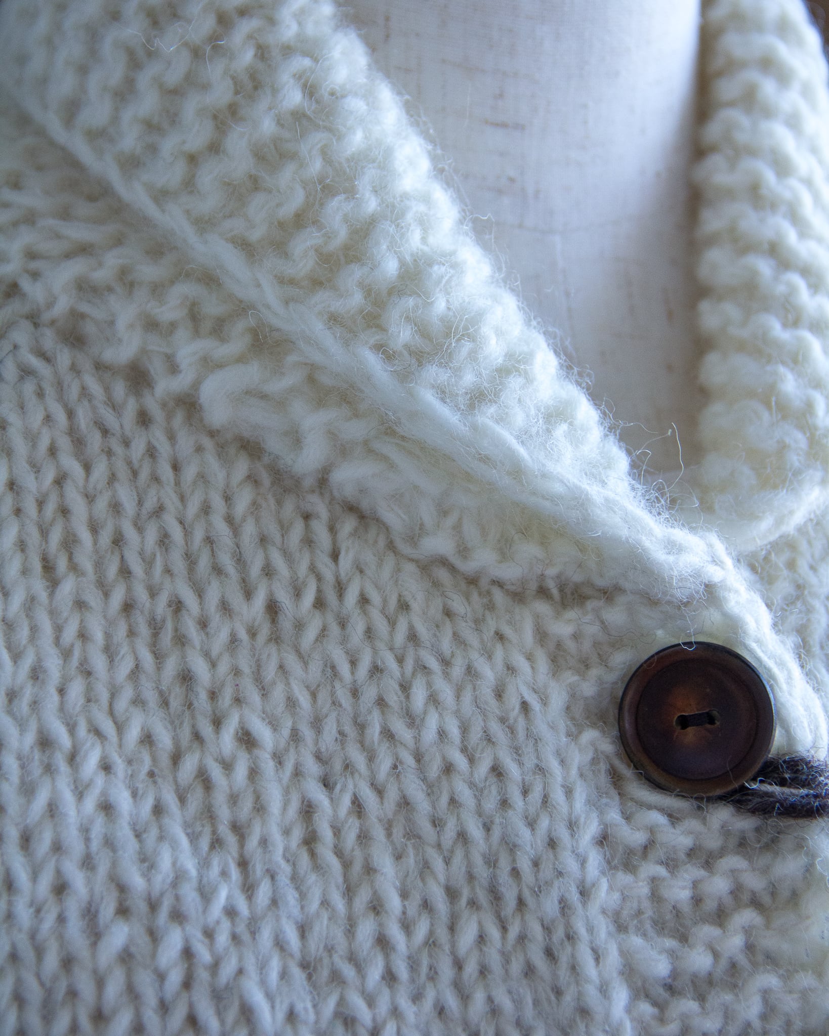程よくフィットするショール衿に、水牛の角から削り出したボタンをあしらい、