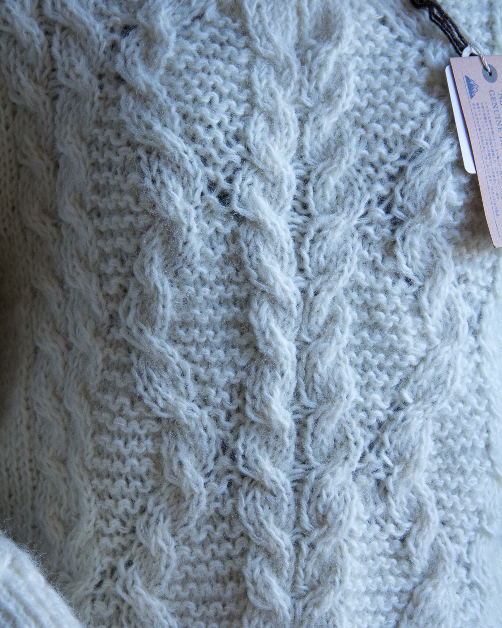 ・立体ケーブル編み × 手編みならではの凹凸感:機械編みでは出せない、陰影と表情。着るたびに個性を引き立てます。