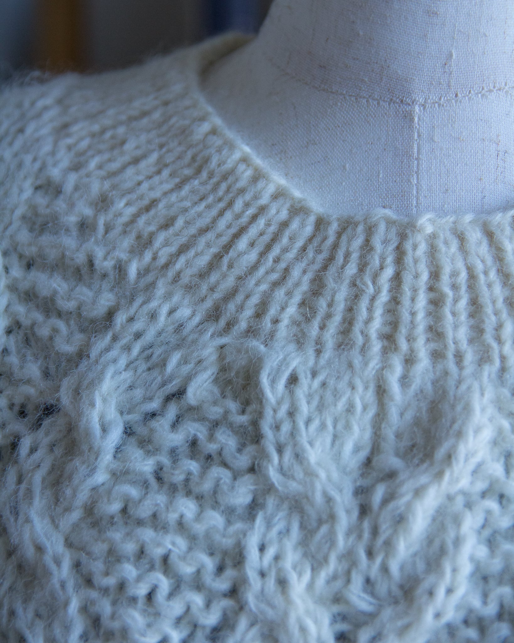 伝統的な手編み技術を駆使し、程よくフィットするクルーネックに、立体感と膨らみのあるケーブル編みを組み合わせた、女性らしい上品な一枚です。