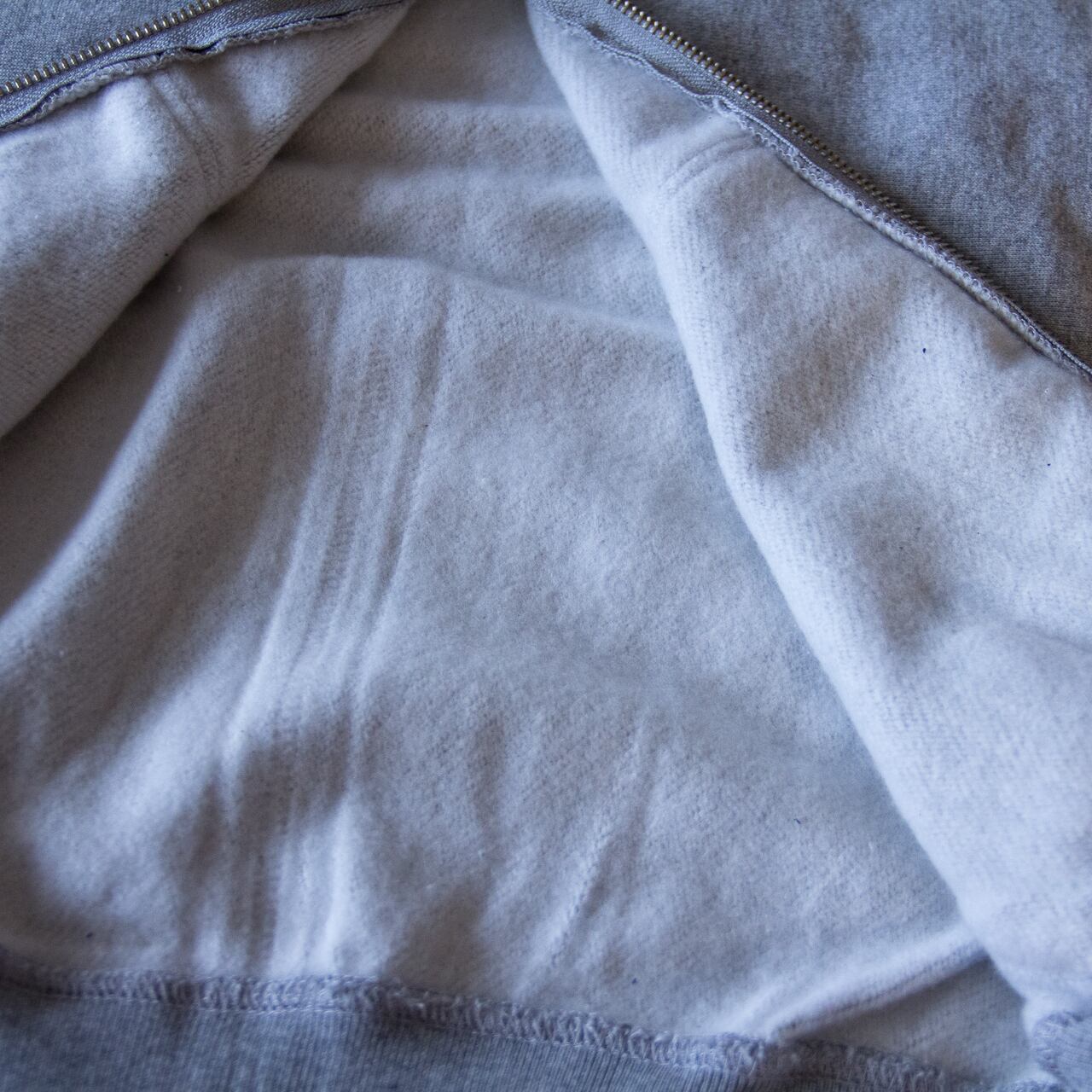 表面はオープンエンド糸特有のザラ感のあるざっくりした風合い、乾いた硬い肌ざわりの厚手生地が特徴。