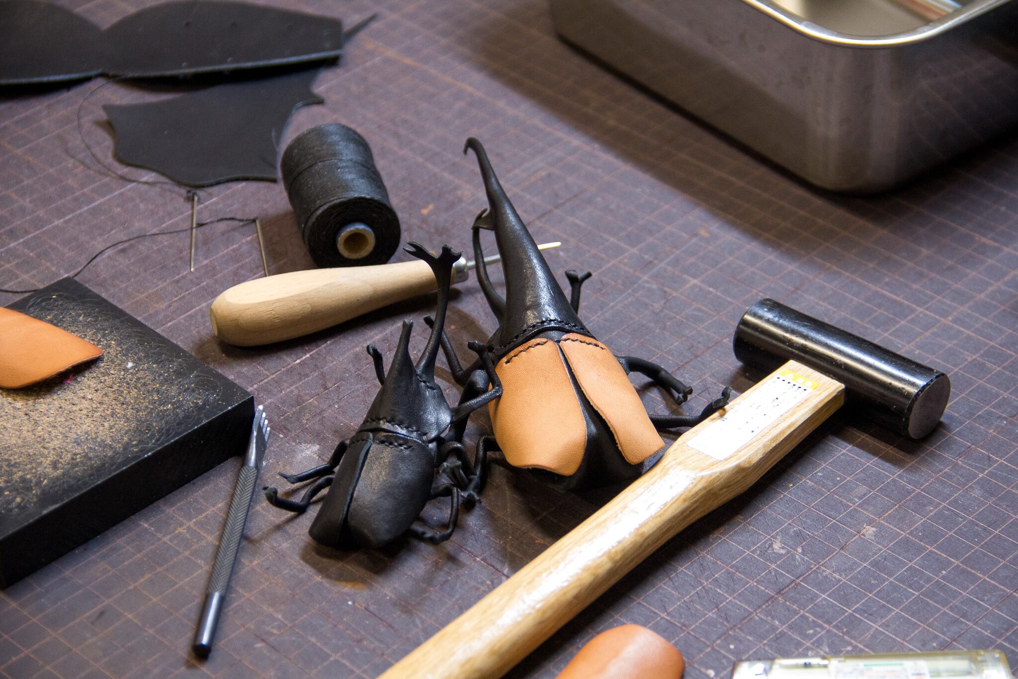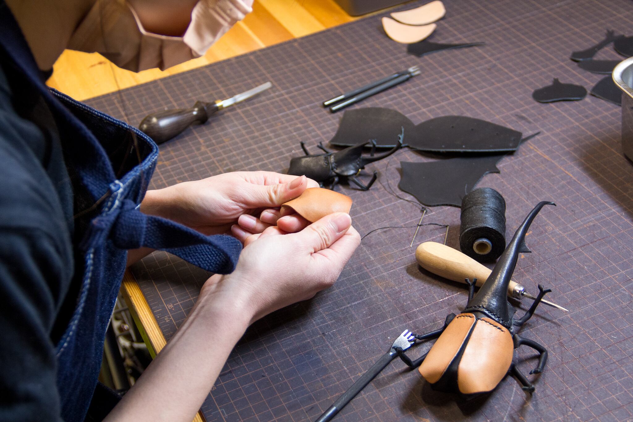 国産牛革をパーツごとに一つ一つ切り出し、水を浸けて乾燥させながら整形し、丁寧に手縫い取り付けます。