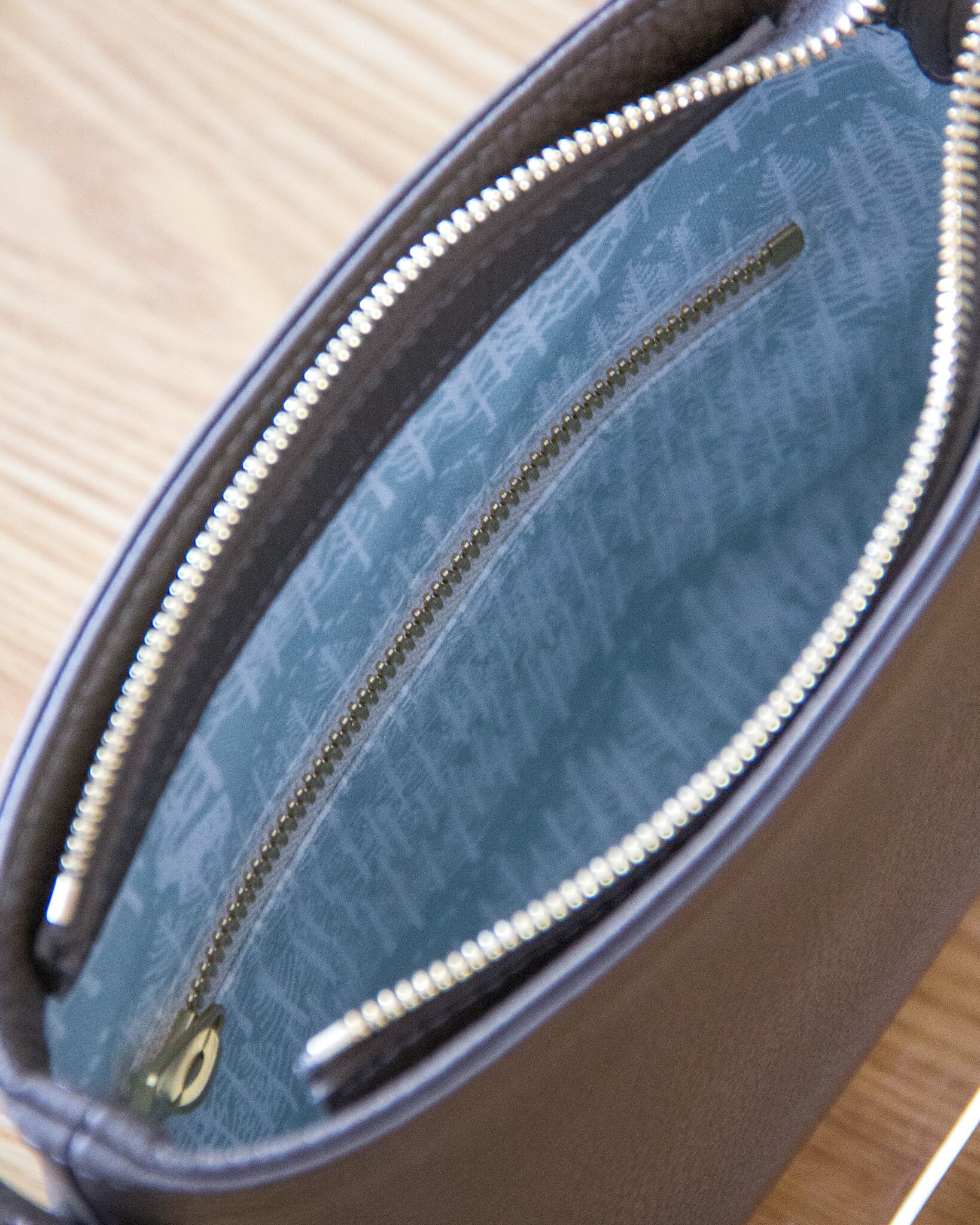 内部にはファスナーポケットと、ボタン付きオープンポケットを備えています。